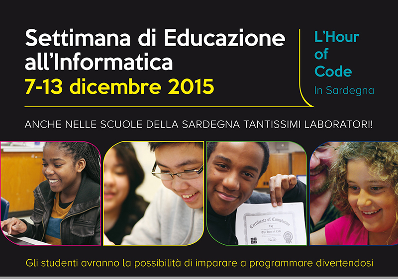 L’associazione Sardegna 2050 aderisce alla “Computer Science Education Week” l’evento globale che si svolge dal 7 al 13 dicembre 2015 e che promuove l’iniziativa Hour of Code, il cui obiettivo è che tutti provino durante la loro vita almeno un’ora di programmazione (in inglese coding).