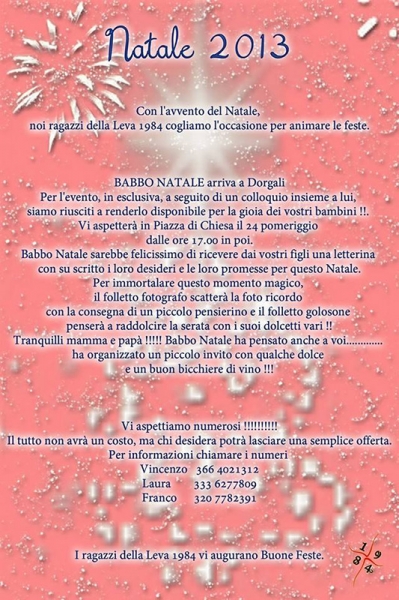 Secondo quanto dichiarato, i ragazzi dell’Ottantaquattro assicurano la presenza di Babbo Natale in Piazza di Chiesa a Dorgali. Il vecchietto tanto amato dai più piccoli sarà felice di ricevere le letterine con i loro desideri e le loro promesse; sarà accompagnato dai suoi folletti più fedeli che lavoreranno insieme per rendere ancora più magico l’evento: il folletto fotografo scatterà le foto ricordo che saranno consegnate con un piccolo pensierino ai bambini fortunati presenti alla manifestazione; il folletto golosone distribuirà dolci a volontà e tanti altri folletti penseranno ad allietare anche i genitori con un piccolo invito da loro offerto.