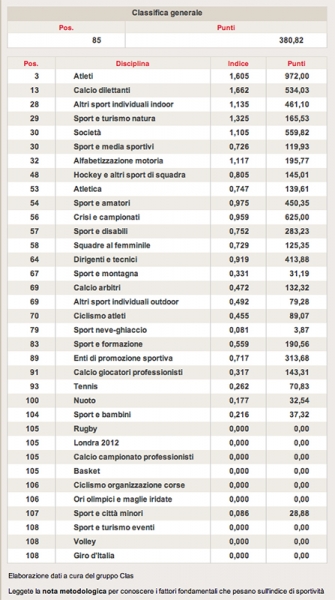 Per conoscere i piazzamenti di ogni singola provincia seguite il link. Di seguito i numeri che stabiliscono l'indice di sportività della provincia di Nuoro.