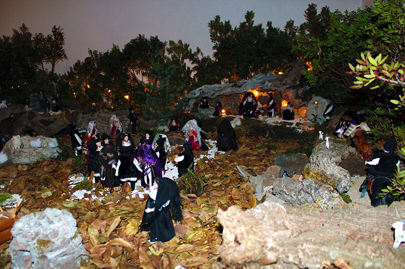 Nel paesaggio mediterraneo rappresentato dalle due donne, ogni minimo particolare è studiato per colpire anche l’occhio dell’osservatore più pigro. Un gruppo di donne e uomini posizionati in cerchio ballano davanti alla Natività, rigorosamente in costume folkloristico; donne intente nei soliti lavori domestici, come la cottura del pane, fanno vivere piccole cucine illuminate da luci intense e calde.