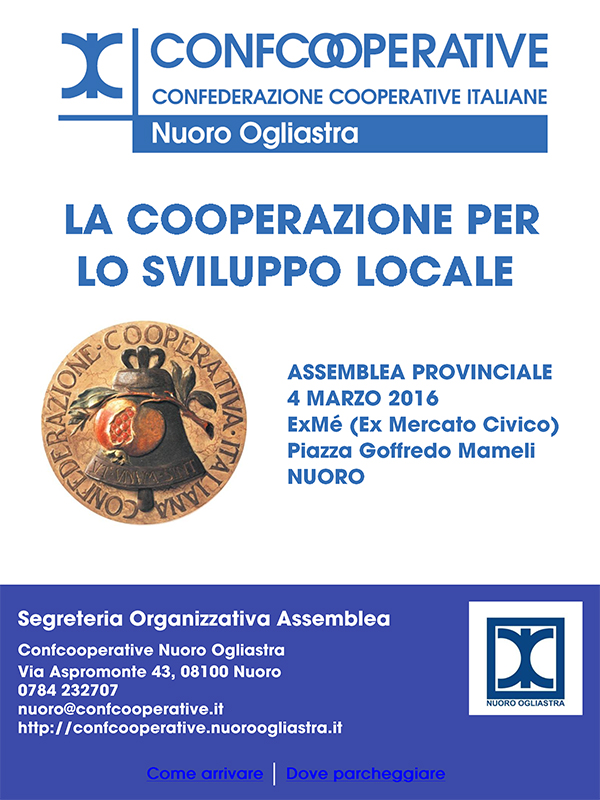 Si terrà venerdì 4 marzo 2016, a partire dalle ore 9:00, presso i locali dell’ExMé (Ex Mercato Civico), in Piazza Goffredo Mameli a Nuoro, l’Assemblea Provinciale di Confcooperative Nuoro Ogliastra dal titolo La Cooperazione per lo Sviluppo Locale.