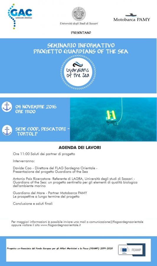 Guardians of the Sea si presenta al pubblico. Venerdì 4 novembre alle ore 11.00 presso la sede della Cooperativa Pescatori a Tortolì si terrà un seminario divulgativo sulle azioni portate avanti finora dal team di lavoro nell’ambito del progetto, partito a gennaio 2016 e finanziato dal Fondo Europeo per le Attività Marittime e la Pesca (FEAMP) 2014-2020.