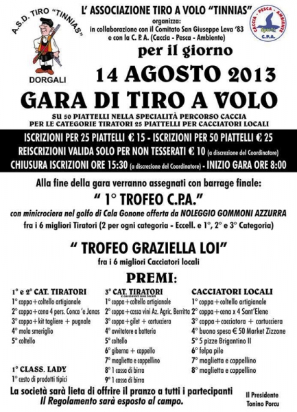 La giornata di ieri è iniziata con la “Gara di Tiro al Piattello” in località Tinnias (Orrule). Sessantacinque partecipanti per la sfida organizzata dall’ASD Tiro Tinnias in collaborazione con C.P.A. (Caccia Pesca Ambiente) e Comitato Leva ‘83. Ecco i cacciatori e tiratori trionfanti:
